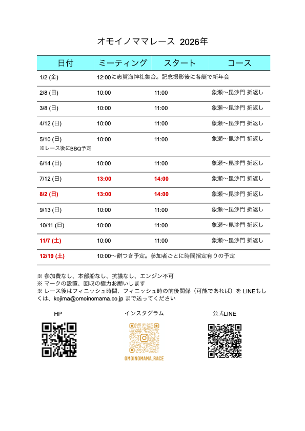 2026年 オモイノママレースについて2025年12月25日 2026年のレーススケジュールです。 基本的には第2日曜日の10時開会式ですが、赤字の部分はイレギュラー開催です。 ・夏は午後スタートです。 ・5月のレース後に小戸公園でBBQ予定です。 ・8月はお盆と重ならないようにしています。 ・11月は福岡マラソン(推測)と重ならないように第1土曜日に行います。 ・12月は第2土曜日にレースをせずに小戸ヨットハーバーで餅つきをやる予定です。 2026年もよろしくお願いいたします。 オモイノママレースPosted by ナラザキ